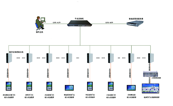 整個辦公區采用數字公告系統實現信息發布顯示,遵循安全性、穩定性、可擴展性、管理維護便捷性的設計原則,C/S與B/S結合的架構,網絡及服務器占用率極低,數據安全存儲并管理,開放的API接口。整個辦公區設計8套顯示終端,覆蓋辦公區主要進出口通道及公共區域,系統通過中央控制端對各個顯示終端進行統一管理、內容發布。