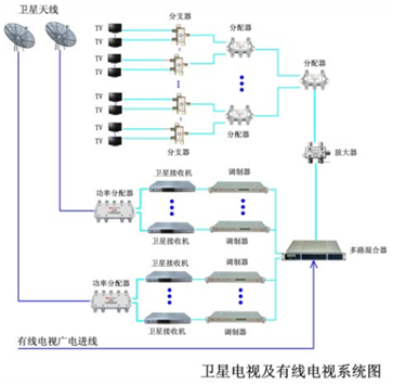 衛(wèi)星電視節(jié)目頻道根據(jù)實際情況選擇衛(wèi)星接收電視節(jié)目內(nèi)容,通過調(diào)制、解調(diào)后混合輸入傳輸干線。