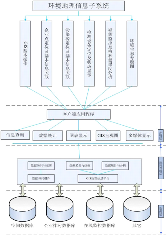 環(huán)境GIS充分利用現(xiàn)代計算機技術優(yōu)勢,發(fā)揮強大的計算統(tǒng)計功能、可視化功能和多媒體展示功能,來管理和利用環(huán)境保護信息。其系統(tǒng)結構框圖如下: